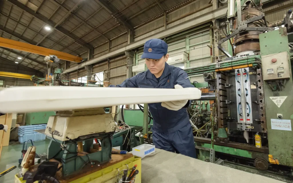 100リットル級アキュームレーターヘッド付きブロー成形機を保有。建設機械の大型ルーフや簡易トイレの壁面パネルなど、メートル単位の製品を一体成形可能。